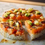 Delicious and easy-to-make Baked Salmon Sushi combines savory cooked salmon with seasoned sushi rice, creamy mayonnaise, and optional spicy sriracha, all baked to perfection and topped with fresh avocado and cucumber. This Japanese-American fusion dish is perfect for a family-style meal with vibrant flavors and comforting textures.