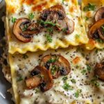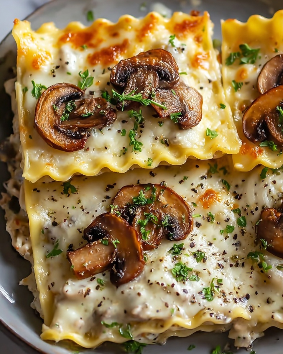 This Mushroom Chicken Alfredo Lasagna combines tender shredded chicken, sautéed mushrooms, and creamy homemade Alfredo sauce layered between perfectly cooked lasagna noodles for a rich and comforting Italian-American main course.